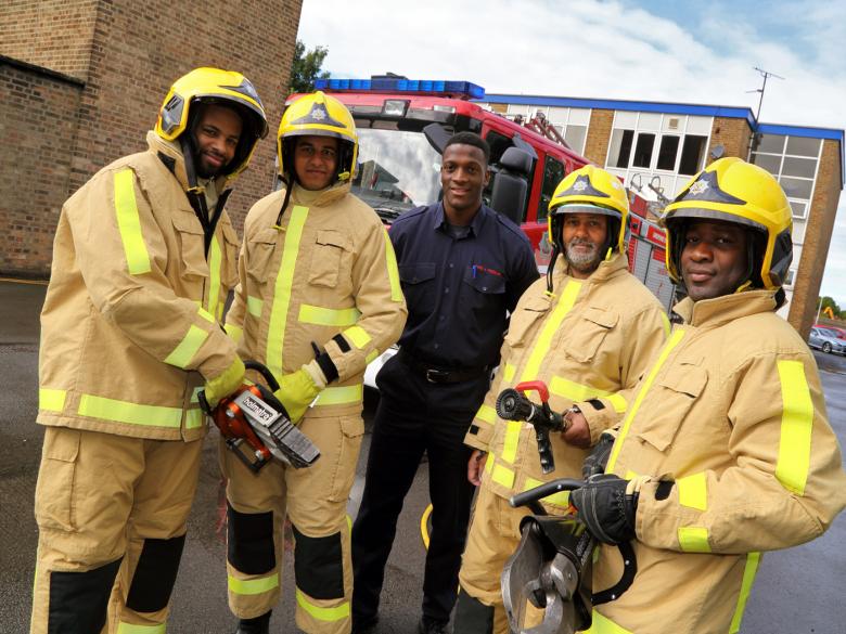 Firefighter Luke Grant with, left to right, Tom Headley, Akib Ali, Tony Stewart and Fitzroy Lindsay at the on call firefighter taster day