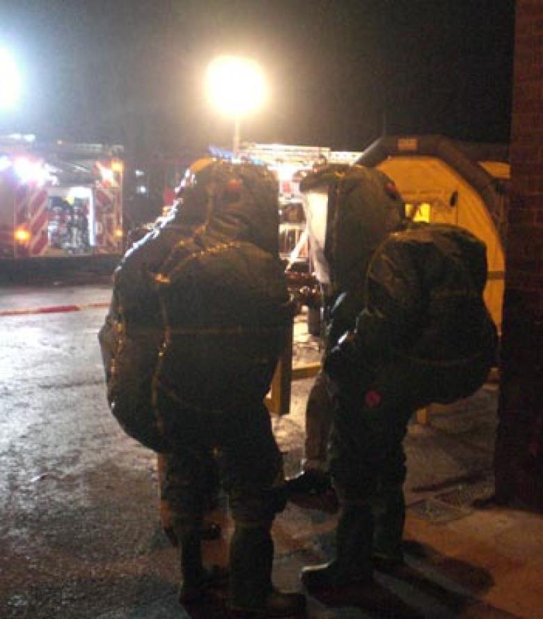 As further crews of firefighters donned breathing apparatus and gastight suits to deal with the chemical leak the Environmental Unit crewed by Albrighton Fire Station arrived at the incident to decontaminate the rescued casualties and the firefighters who had been working in the chemical spill area.
