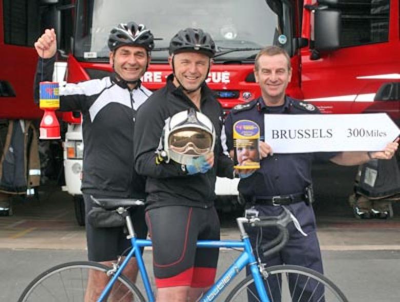 Chief Fire Officer Paul Raymond (right) gives his support to firefighter Nick Herbert and fire authority member Keith Roberts (left) as they prepare for their charity bike ride to Brussels in aid of cystic fibrosis