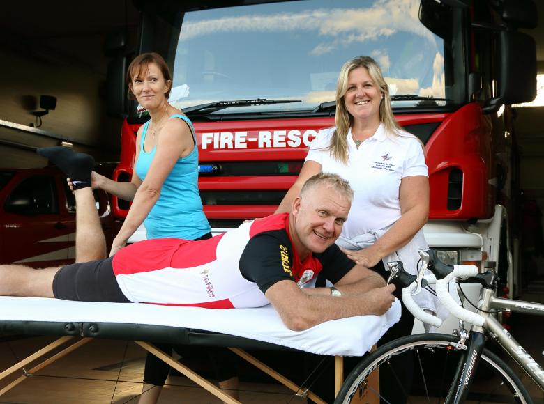 Graham is with Zoe Foster, a sports massage therapist and Helen Smith, an Indian head masseur at the end of the first day of the cycle ride to visit all 23 Shropshire fire stations.
