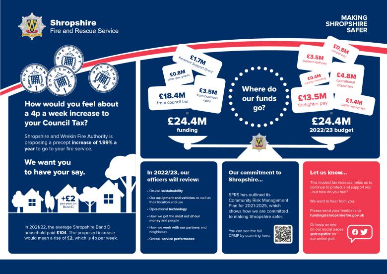 To let us know your thoughts on the proposed increase of 4p per week please email funding@shropshirefire.gov.uk. Alternatively keep an eye on our social media channels for our poll. The consultation will run until Monday 14 February.