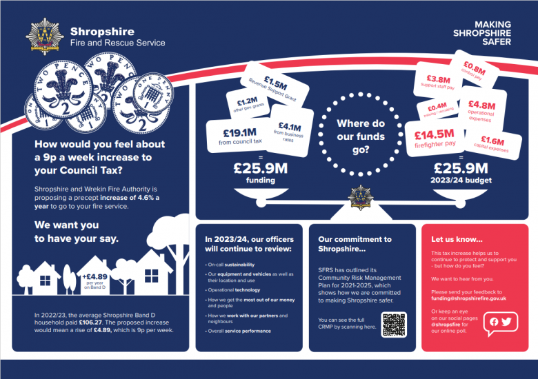 To let us know your thoughts on the proposed increase of 9p per week please email funding@shropshirefire.gov.uk. Alternatively keep an eye on our social media channels for our poll.