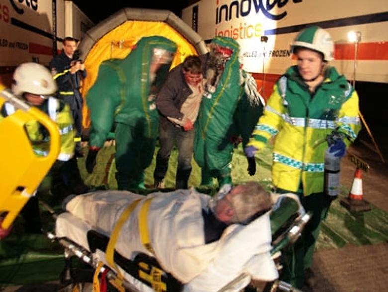 Meanwhile a decontamination unit is set up at the scene to remove the chemical from both the injured and their rescuers.