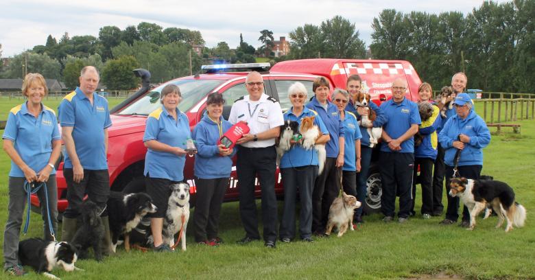 Martin Huckle, a Watch Manager at Shropshire Fire & Rescue Service, receives a set of Smokey Paws Pet Oxygen Masks from Jo Edwards and members of the Shrewsbury Dog Training Club.