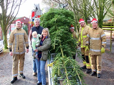 The Christmas tree is strapped to ladders on board a reserve fire engine on its way to church. Pictured left to right are Firefighter Rob Sheppard with Hoo Farm’s Caroline and Edward Dorrell and grandson Stanley with Stu Paige, Crew Manager Steve Moss and Watch Manager Aubrey Thomas.