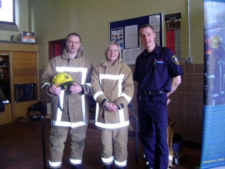 From left to right: two potential new recruits in fire kit - Mr W. Rollo, Mrs M. Pilling and Hodnet firefighter Mr P. Benbow