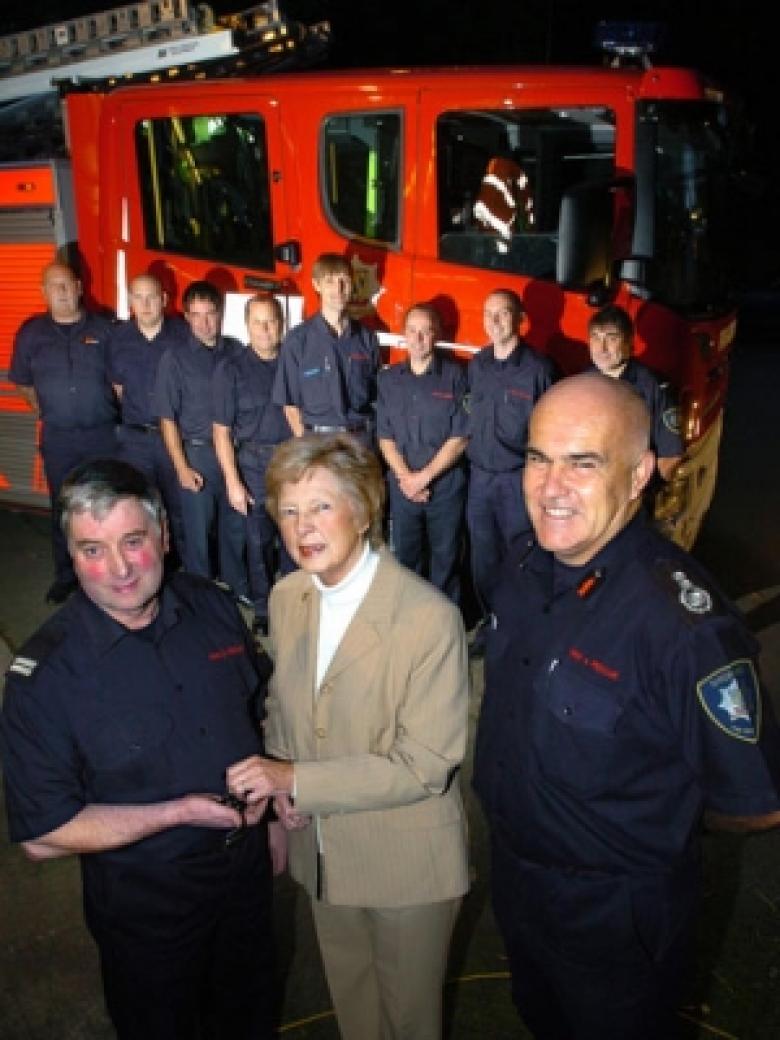 Fire Authority vice chairman Yvonne Holyoak officially hands over the new fire engine for Minsterley to Sub Officer Bob Morris (left) with Chief Fire Officer Alan Taylor (right) and the Minsterley fire crew. Photograph courtesy of Shropshire Star