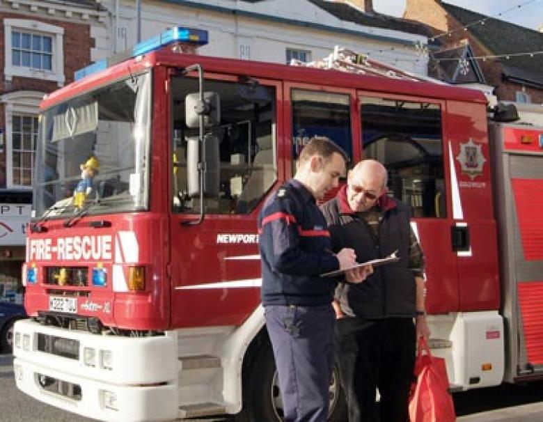 Newport firefighter Adam Mathews consults a shopper in the High Street survey