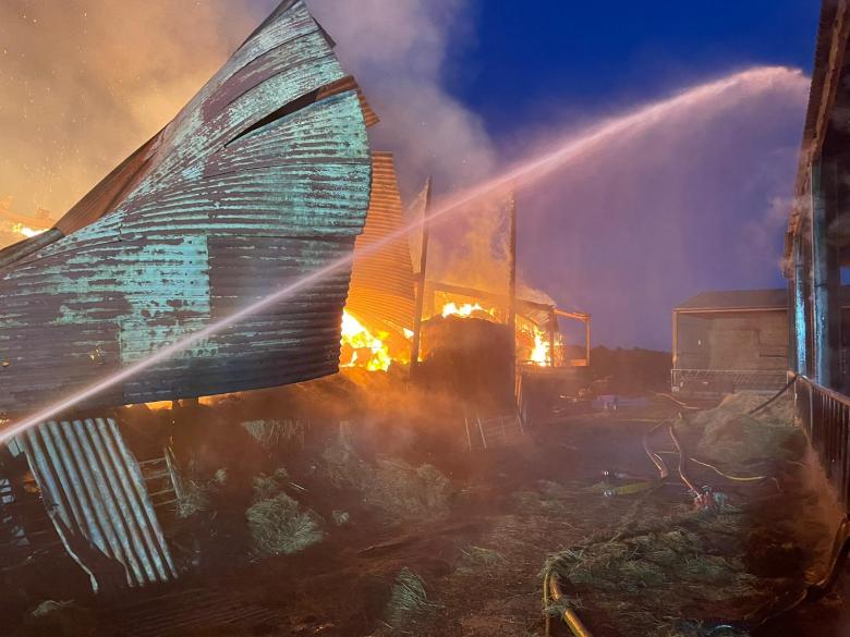 Crews are still dealing with the incident and although operations have been scaled down, we expect to be there for some time. There is still a considerable amount of hay on fire causing a smoke plume which is travelling across the fields.