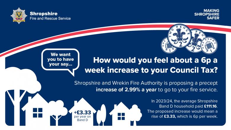 Shropshire and Wrekin Fire Authority is proposing an increase of 2.99 per cent to the portion of council tax which goes to Shropshire Fire and Rescue Service. This equates to just over £3.30 per year, or 6p per week and we want to hear what you think about the proposal.