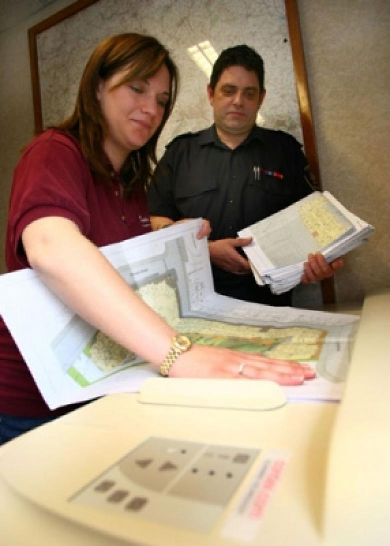 Plans are scanned - data input clerk Rachel Harrison with Dave Bartlett