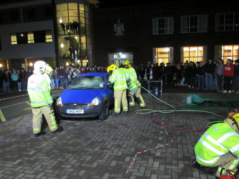 About 300 first year students from Harper Adams University, Edgmond, Nr Newport, witnessed a crew from Shropshire FIre & Rescue's Newport retained station demonstrate rescue techniques to release a casualty from a scrap saloon vehicle which had been involved in a road traffic collision.