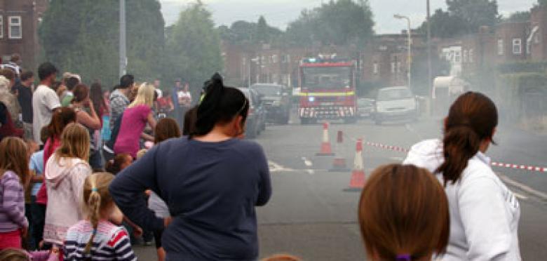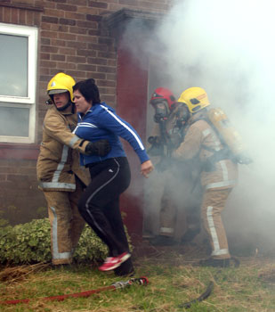 Neighbours lined the streets to watch two scenarios involving a house fire. They clearly saw how householders first escaped unscathed because they had been alerted by a working smoke alarm.