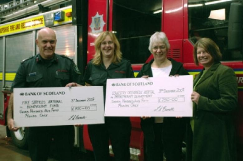 On Monday 3rd December, Sally presented two cheques of £750 each to Chief Fire Officer Alan Taylor receiving the cheque for the Fire Services National Benevolent Fund and Jane Weston and Sandra Evans receiving the cheque for Oswestry Orthopaedic Hospital Physiotherapy Department.