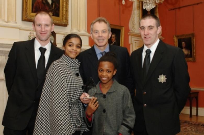 Prime Minister Tony Blair with Leeds youngsters, Giovanna and Arianna Burt and Durham and Darlington FRS firefighters, Steve Binns and Paul Myers, the UK's Bravest Firefighters of the Year