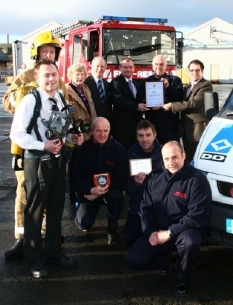Chief Fire Officer Alan Taylor presents the awards to General Manager John Patterson (left) and Finance Director Paul Price with firefighters (left to right) Gary Kilroy, Kenton Cawley and Mark Jones.